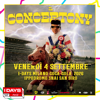 TonyPitony is the only Italian artist announced as a headliner for the 2026 edition of I-DAYS Milano Coca-Cola. His show, “IL CONCERTONY,” is set for Friday, September 4, 2026, at Ippodromo Snai San Siro in Milan, and tickets for this date are already available.